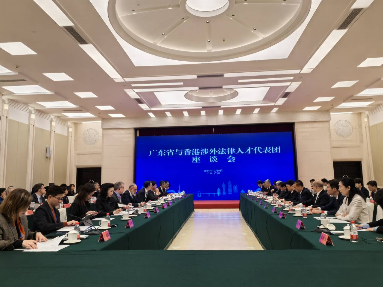 本网讯 12月5日,香港“涉外法律人才”代表团访问广东。广东省副省长刘国周会见特区政府律政司司长林定国一行并座谈交流。中央政府驻港联络办副主任刘光源应邀出席并致辞。