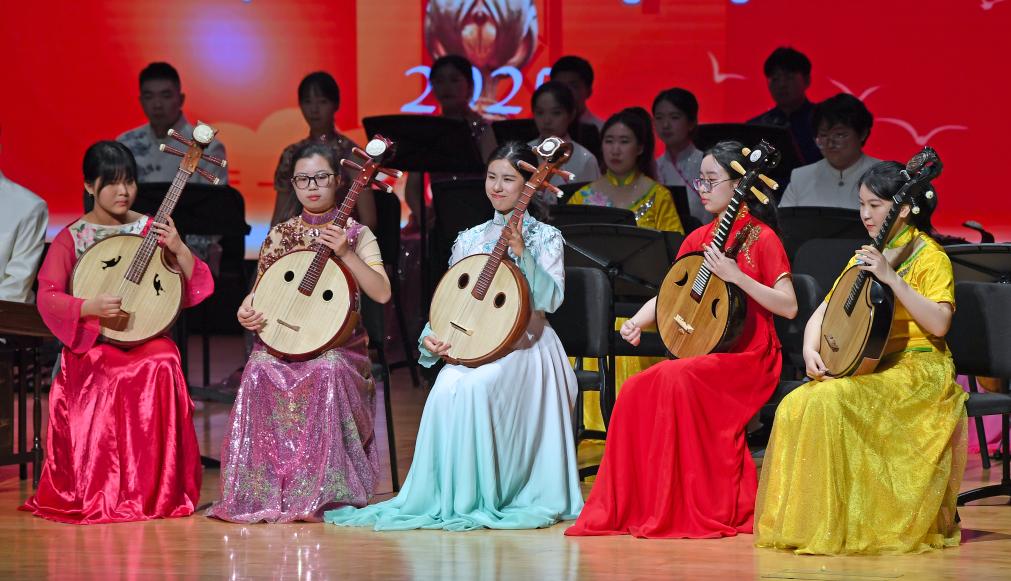 1月19日,南京大学民族乐团在音乐会上演出中阮齐奏《丝路驼铃》。新华社记者 陈铎 摄