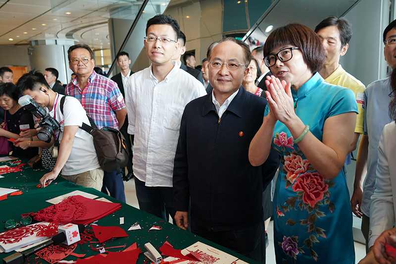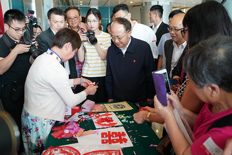 王志民主任參觀剪紙藝術(shù)展臺(tái)。(圖片來(lái)源:中央政府駐港聯(lián)絡(luò)辦)