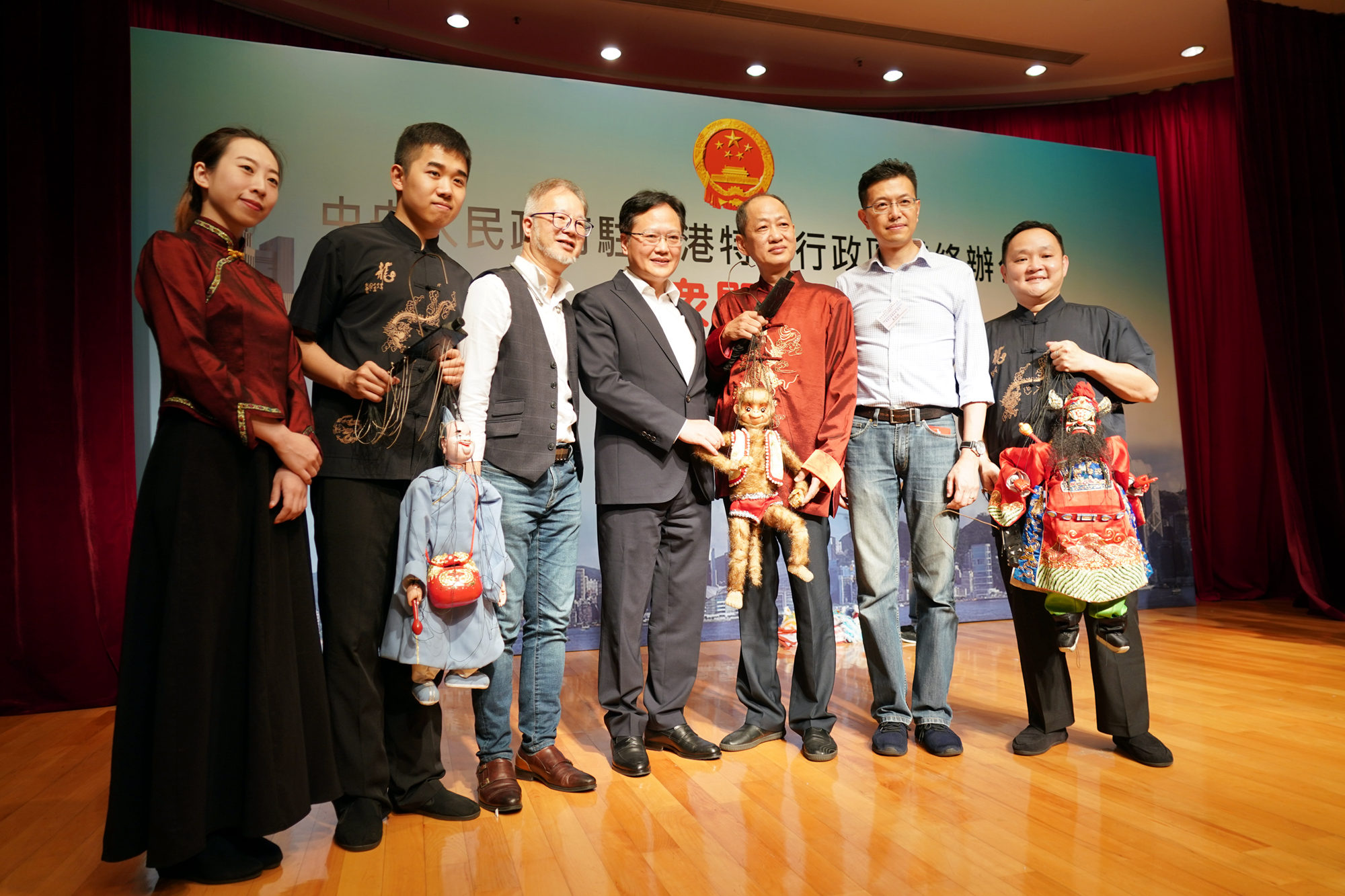 陳冬副主任等與木偶戲表演團隊合影。(圖片來源:中央政府駐港聯絡辦)