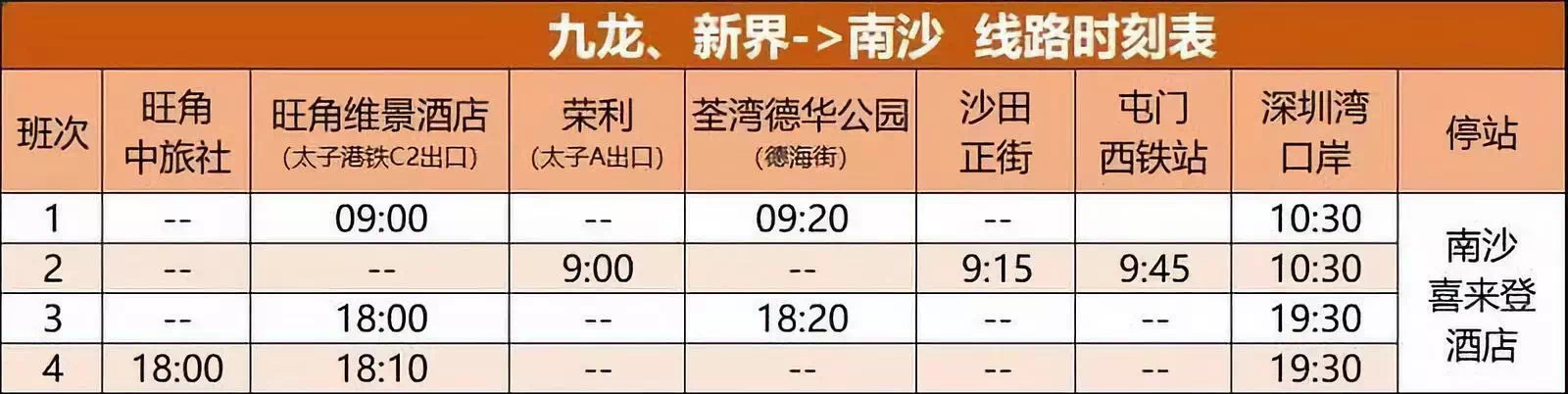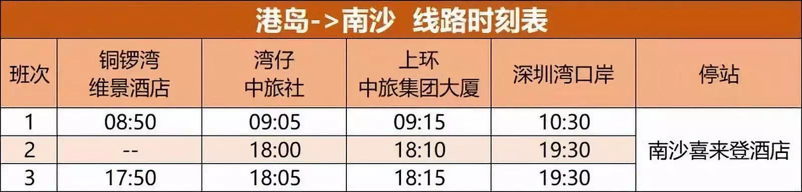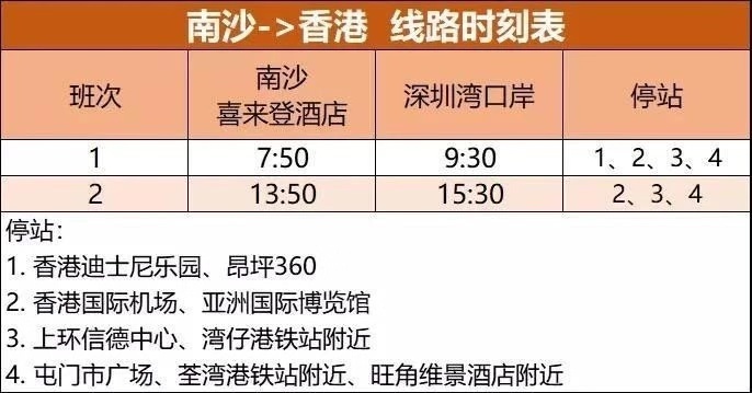 目前,南沙至香港發(fā)車時(shí)間為每日早晨7:50和下午13:50,沿途可停靠香港迪士尼樂園、昂坪360、香港國(guó)際機(jī)場(chǎng)、亞洲國(guó)際博覽館、上環(huán)信德中心、灣仔港鐵站、屯門市廣場(chǎng)、荃灣港鐵站、旺角維景酒店等地。香港居民亦可在上述站點(diǎn)乘坐巴士。