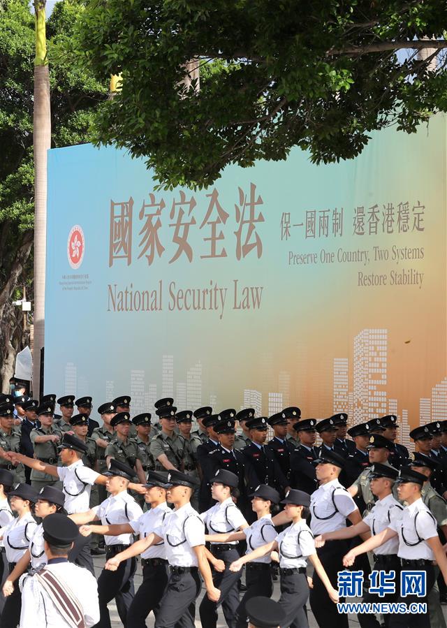 金紫荊廣場一旁,放置了一塊寫有“國家安全法 保‘一國兩制’還香港穩(wěn)定”的大型宣傳板。受新冠肺炎疫情影響,今年的升旗儀式不設(shè)公眾觀禮區(qū)。