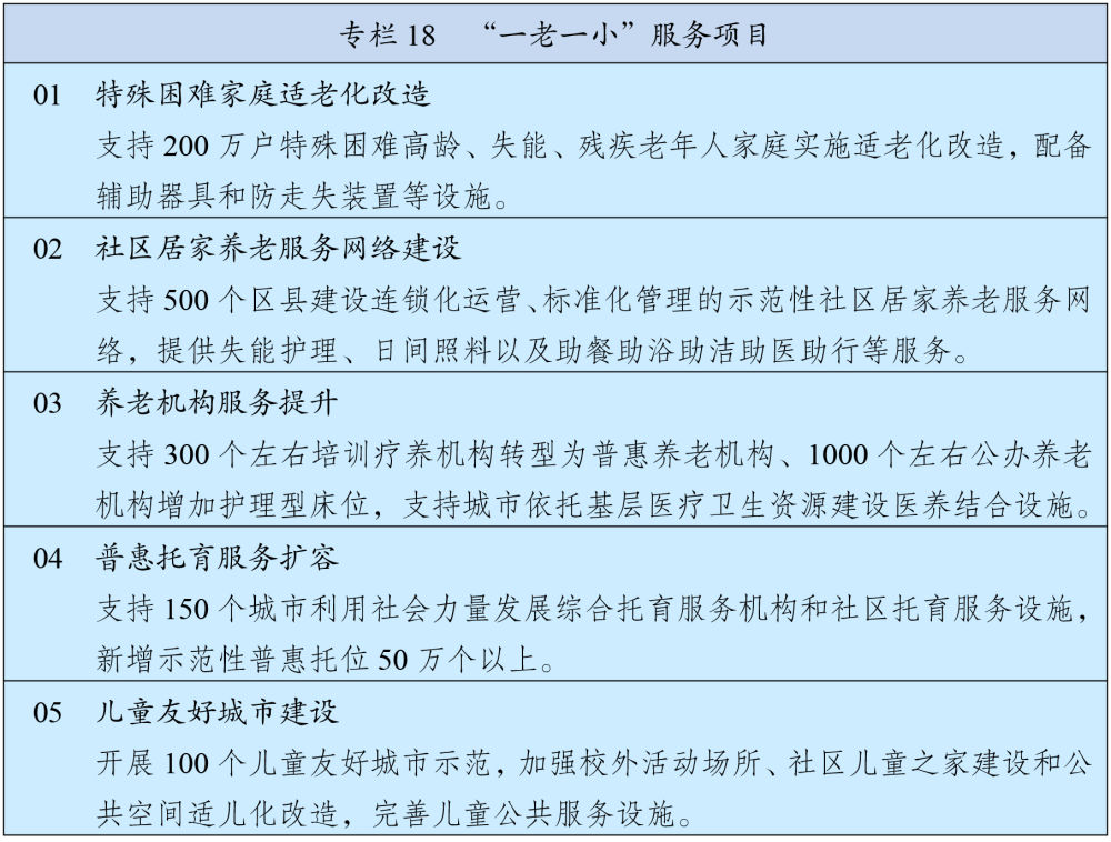 推動養老事業和養老產業協同發展,健全基本養老服務體系,大力發展普惠型養老服務,支持家庭承擔養老功能,構建居家社區機構相協調、醫養康養相結合的養老服務體系。完善社區居家養老服務網絡,推進公共設施適老化改造,推動專業機構服務向社區延伸,整合利用存量資源發展社區嵌入式養老。強化對失能、部分失能特困老年人的兜底保障,積極發展農村互助幸福院等互助性養老。深化公辦養老機構改革,提升服務能力和水平,完善公建民營管理機制,支持培訓療養資源轉型發展養老,加強對護理型民辦養老機構的政策扶持,開展普惠養老城企聯動專項行動。加強老年健康服務,深入推進醫養康養結合。加大養老護理型人才培養力度,擴大養老機構護理型床位供給,養老機構護理型床位占比提高到55%,更好滿足高齡失能失智老年人護理服務需求。逐步提升老年人福利水平,完善經濟困難高齡失能老年人補貼制度和特殊困難失能留守老年人探訪關愛制度。健全養老服務綜合監管制度。構建養老、孝老、敬老的社會環境,強化老年人權益保障。綜合考慮人均預期壽命提高、人口老齡化趨勢加快、受教育年限增加、勞動力結構變化等因素,按照小步調整、彈性實施、分類推進、統籌兼顧等原則,逐步延遲法定退休年齡,促進人力資源充分利用。發展銀發經濟,開發適老化技術和產品,培育智慧養老等新業態。