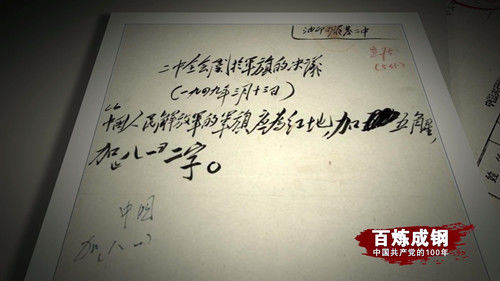 手稿上,毛澤東特別批示,在中國人民解放軍軍旗上加上“八一”二字。