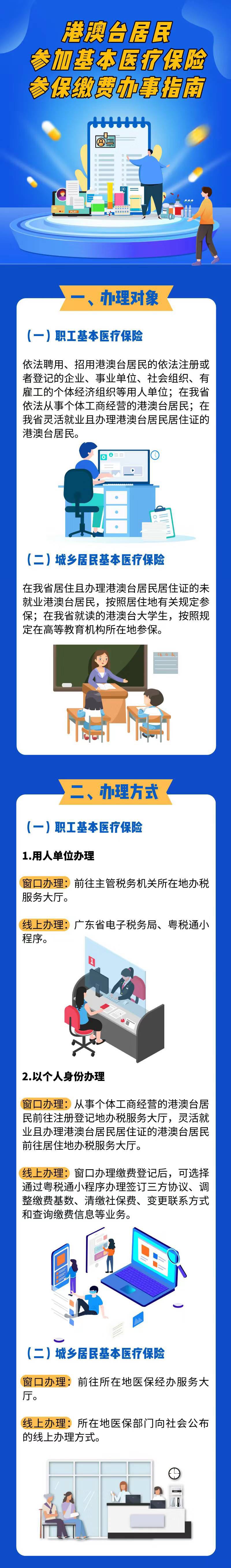 廣東省醫(yī)療保障局聯(lián)合廣東省稅務(wù)局日前印發(fā)《香港澳門臺灣居民參加基本醫(yī)療保險參保繳費辦事指南》(以下簡稱《辦事指南》),以便更好促進(jìn)在廣東省學(xué)習(xí)、就業(yè)、生活的港澳臺居民參加基本醫(yī)療保險。