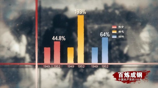 同1949年相比,1952年糧食產量增長44.8%,棉花增長193%,油料增長64%。