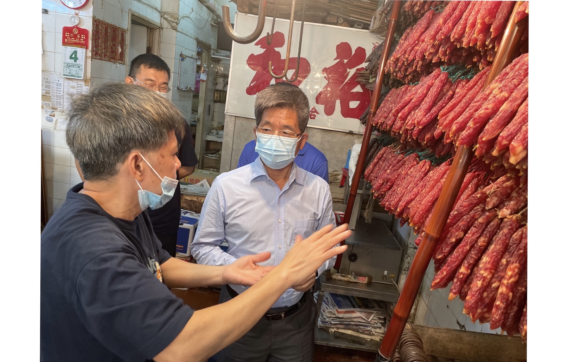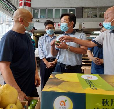 國慶期間,香港中聯辦秘書長王松苗與行財部陳志斌等12名同事一道,分三組先后到西環副食品批發市場、深水埗北河街街市、跑馬地黃泥涌街市、香港仔鴨脷洲街市、德輔道、海味街等地落區聆聽。三個落區調研組重點走訪了西環昌盛號、穩記鮮果、聯發土產等10余個商鋪,問問“菜籃子”,聊聊“果盤子”,了解貨品價格、進貨渠道、銷售情況以及疫情影響。特區政府有關部門人員參加了個別走訪。