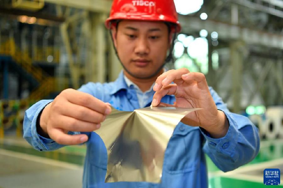 在位于山西的太鋼集團,員工展示用手撕開0.02毫米厚的超薄帶狀不銹鋼(2019年5月24日攝)。(新華社記者 曹陽 攝)