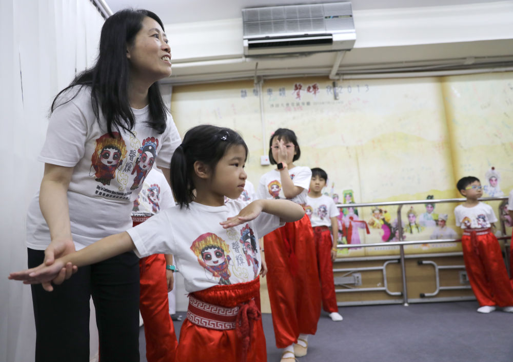 粵劇主要流行于廣東、廣西和香港、澳門等地區。圖為香港聲輝粵劇推廣協會會長芳雪瑩(左)在指導孩子們練功(資料照片)。(新華社記者 吳曉初 攝)