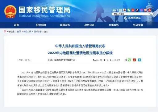 據(jù)中華人民共和國出入境管理局政府網(wǎng)站消息,2022年,內(nèi)地居民赴港澳地區(qū)定居夫妻團聚類審批分數(shù)線為146.1分,即2018年12月31日之前夫妻分居;子女照顧父母類審批分數(shù)線為60分,即申請人年齡為18至59周歲,在香港或者澳門定居的父母年齡均為60周歲以上且在香港或者澳門無子女;子女投靠父母類審批分數(shù)線為1分,即申請人未滿18周歲,父母均在香港或者澳門定居;父母投靠子女類審批分數(shù)線為1分,即申請人年齡為60周歲以上且在內(nèi)地無子女,需要投靠在香港或者澳門定居的18周歲以上子女。