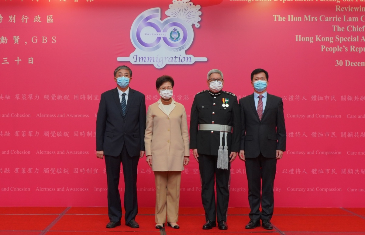 本網訊 12月30日,香港入境事務處在入境事務學院舉行學員結業暨六十周年大會操。香港特區行政長官林鄭月娥檢閱會操并致辭,香港中聯辦副主任羅永綱出席活動并觀禮。