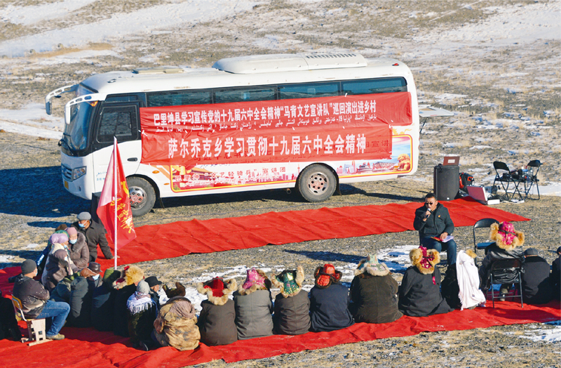 新疆巴里坤哈薩克自治縣組建“馬背文藝宣講隊”,深入邊遠農牧區鄉村開展黨的十九屆六中全會精神巡回宣講。圖為2021年12月1日,宣講隊給冬牧場的哈薩克族牧民宣講全會精神。(人民圖片 張建剛 攝)