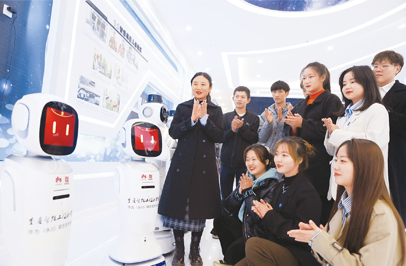 2021年11月13日,重慶智能工程職業學院校園內,智能機器人“大華”、“大智”向學生們普及黨的十九屆六中全會精神,其可愛的形象和聲音,深受學生們的喜愛。(人民圖片 陳仕川 攝)