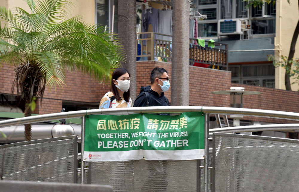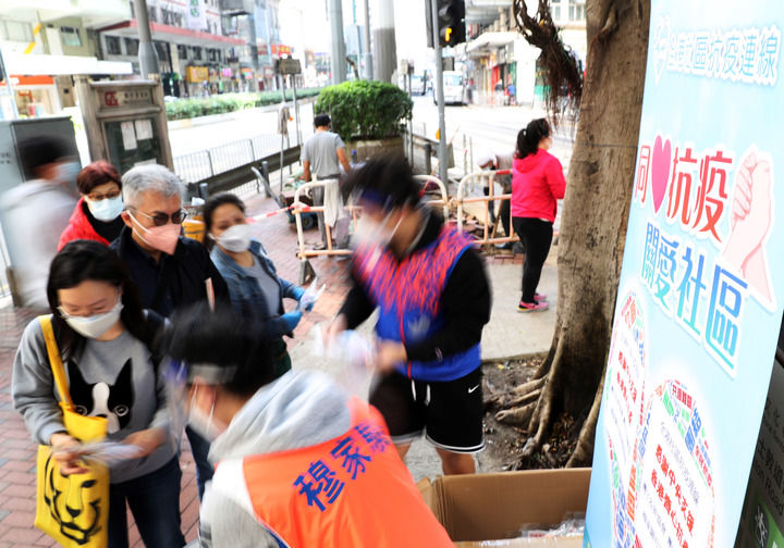 3月1日,在香港灣仔區一處街站,義工免費派送中央援港抗疫物資。(新華社記者李鋼 攝)