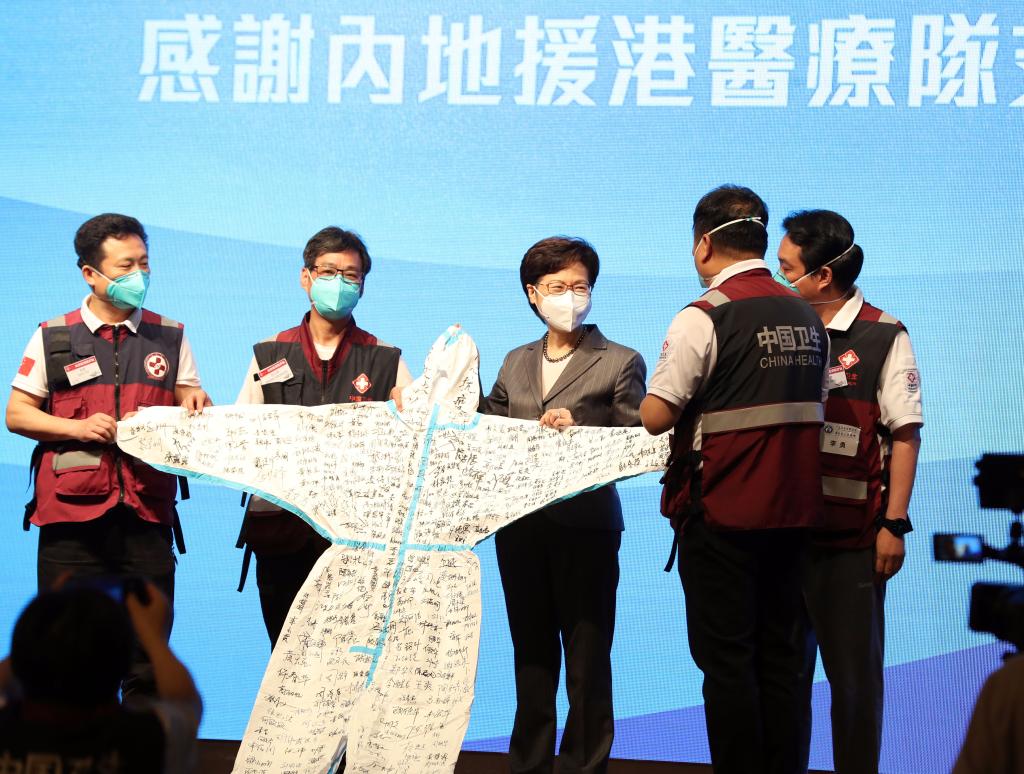 5月5日,內地援港醫療隊向香港特區行政長官林鄭月娥(左三)贈送簽名防護衣。(新華社記者 李鋼 攝)