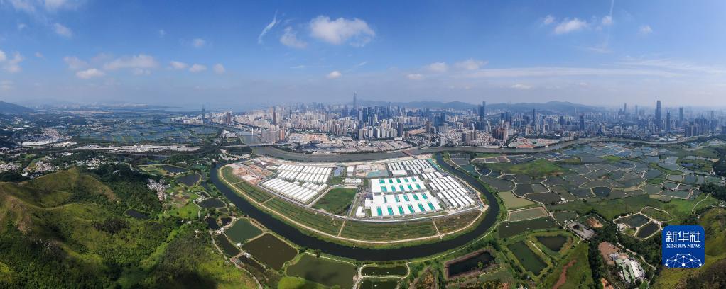 這是中央援港應急醫院和落馬洲方艙設施項目全景圖(無人機照片,5月6日攝)。(新華社記者 梁旭 攝)