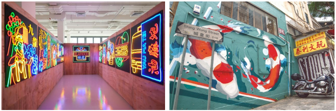 西九龍文化區藝術展覽(左)、荷里活道中式錦鯉壁畫(右)。(圖源香港旅游發展局)