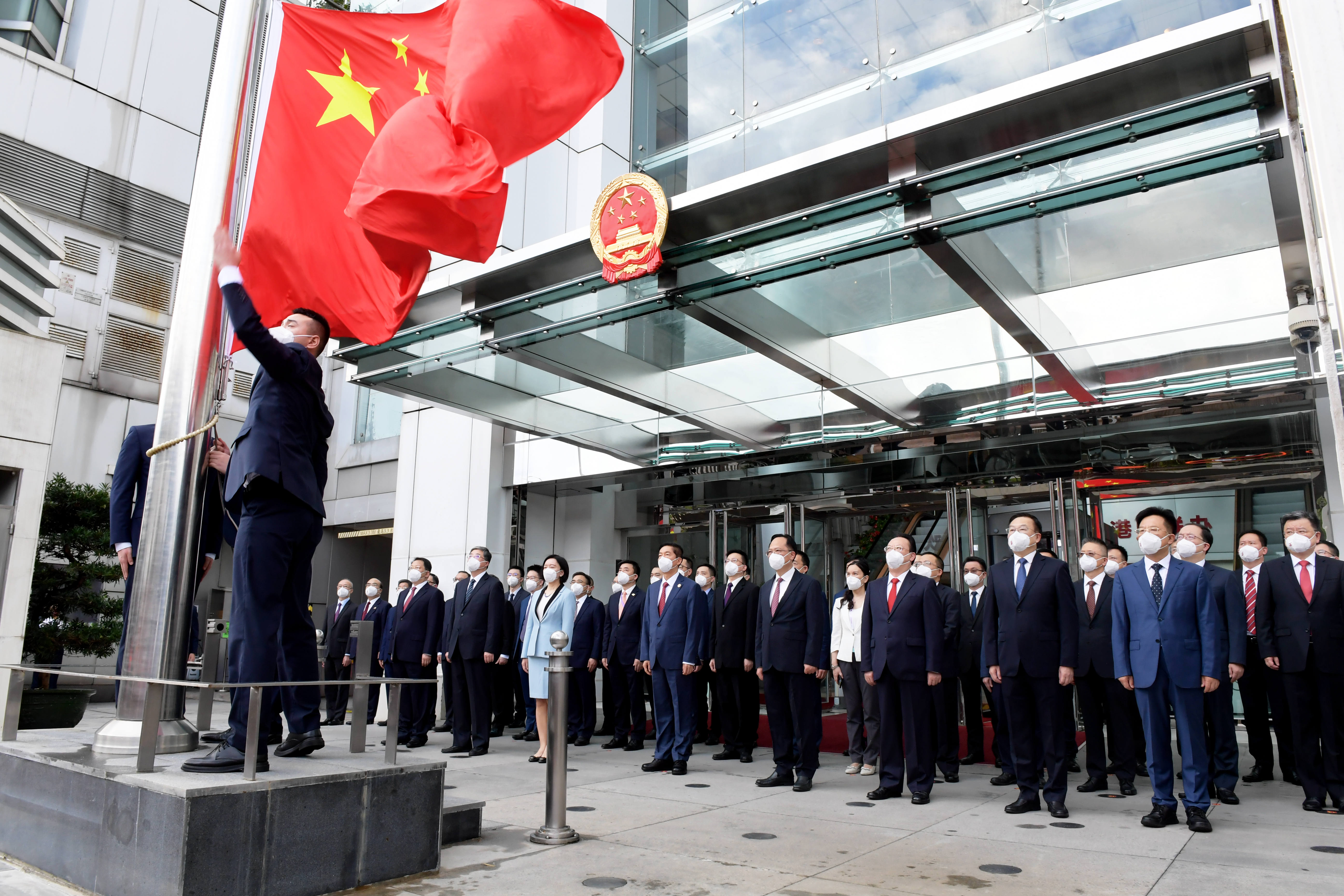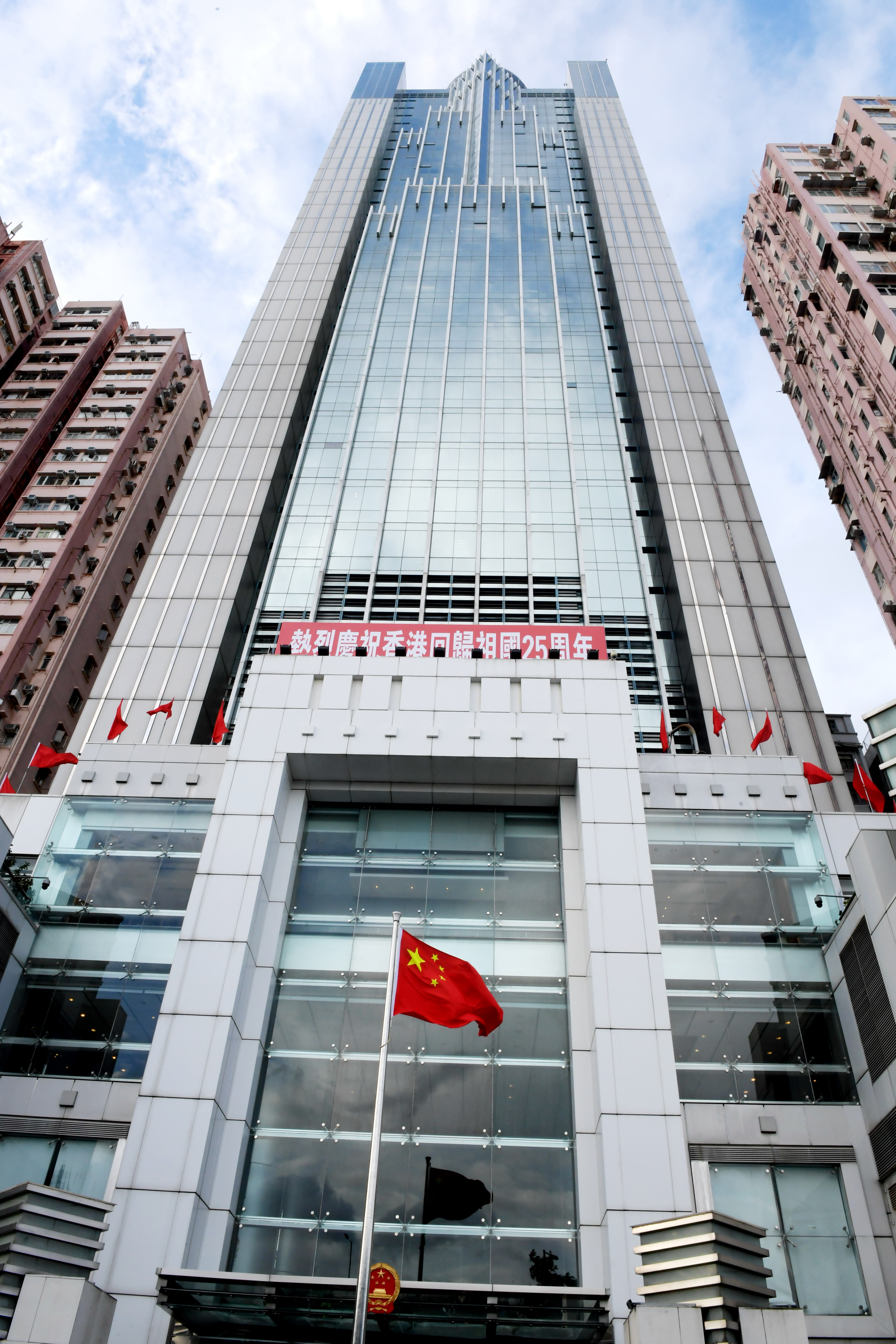 7時整,升國旗儀式開始。香港中聯辦主任駱惠寧,副主任陳冬、盧新寧、譚鐵牛、羅永綱、何靖、尹宗華和秘書長王松苗,以及干部員工在辦公樓前莊嚴肅立。升旗手步伐有力,精神盎然,護送國旗進場。伴隨著雄壯嘹亮的《義勇軍進行曲》,鮮艷的五星紅旗獵獵招展,冉冉升起。全體人員面向國旗行注目禮,高唱國歌,展示對偉大祖國的崇高敬意,展示對香港美好未來的堅定信心,展示對香港同胞的誠摯祝福。