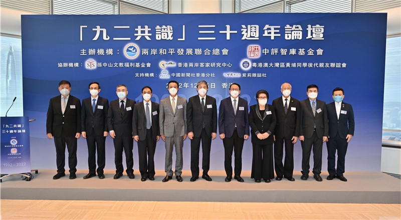 本網訊 12月5日,由兩岸和平發展聯合總會、中評智庫基金會聯合主辦的“九二共識”30周年論壇在港舉行。特區政府政務司司長陳國基、中央政府駐港聯絡辦副主任羅永綱出席并致辭,海峽兩岸關系協會會長張志軍、國民黨前主席洪秀柱視頻致辭。香港涉臺社團代表、居港臺胞逾100人參加。