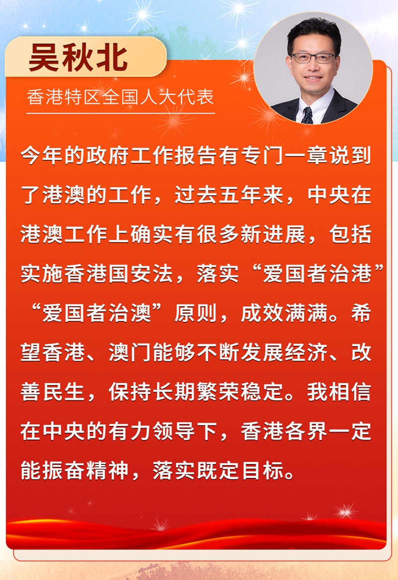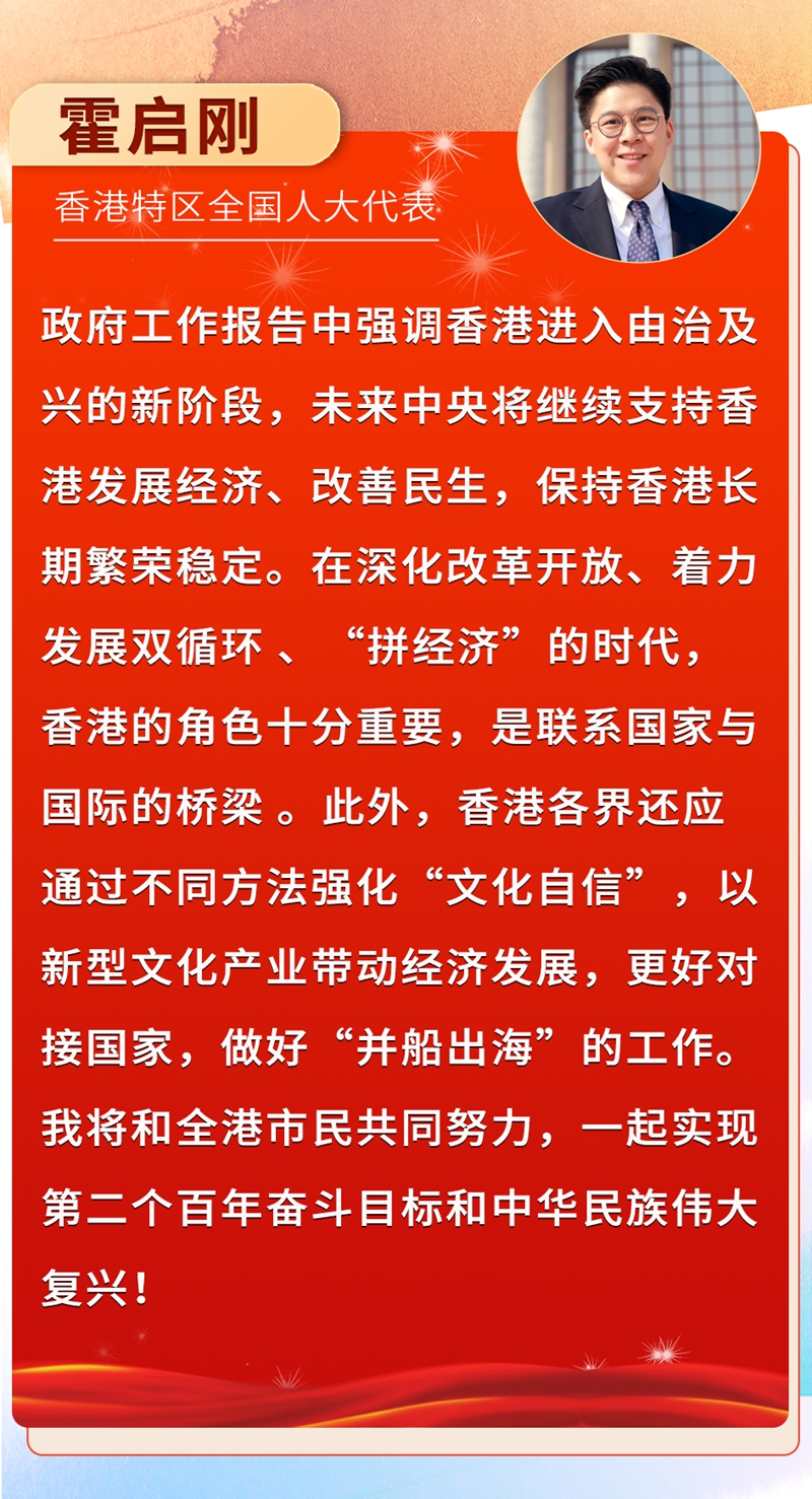 十四屆全國人大一次會議3月5日在北京開幕。多位港澳特區(qū)代表委員接受大灣區(qū)之聲記者采訪時表示,政府工作報告內(nèi)容充實,鼓舞人心,港澳各界要緊抓發(fā)展機(jī)遇,融入國家發(fā)展大局,與祖國并進(jìn)!