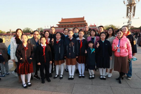 “國旗送給你,香港和我們是一家人。”香港獅子會中學的呂銘琛在觀旗現場意外收獲了一份“禮物”,身旁一位來自河南的女孩得知他是香港同胞后,主動將手中的五星紅旗贈與了他。雖是未曾相識的陌生人,但這句暖心的話語一下子就拉近了兩人之間的距離,他們互加微信,希望即使離開北京后也能保持聯系。這位河南女孩還熱情地向他邀約:“歡迎你們來河南玩。”在長安街紅墻黃瓦、紅棠綠柳的映襯下,青少年們交往交心的笑容顯得格外明媚。