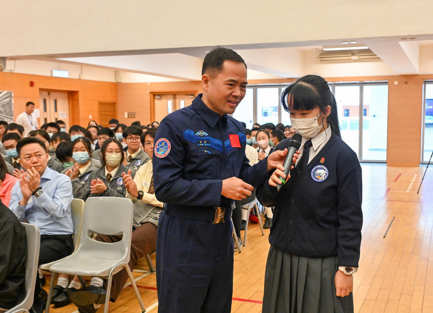 中國載人航天工程代表團11月29日繼續(xù)在港訪問,圖示神舟十五號乘組航天員張陸(左)出席在香港浸會大學附屬學校王錦輝中小學(中學部)舉行的“中國載人航天工程代表團與中、小學生真情對話”活動。