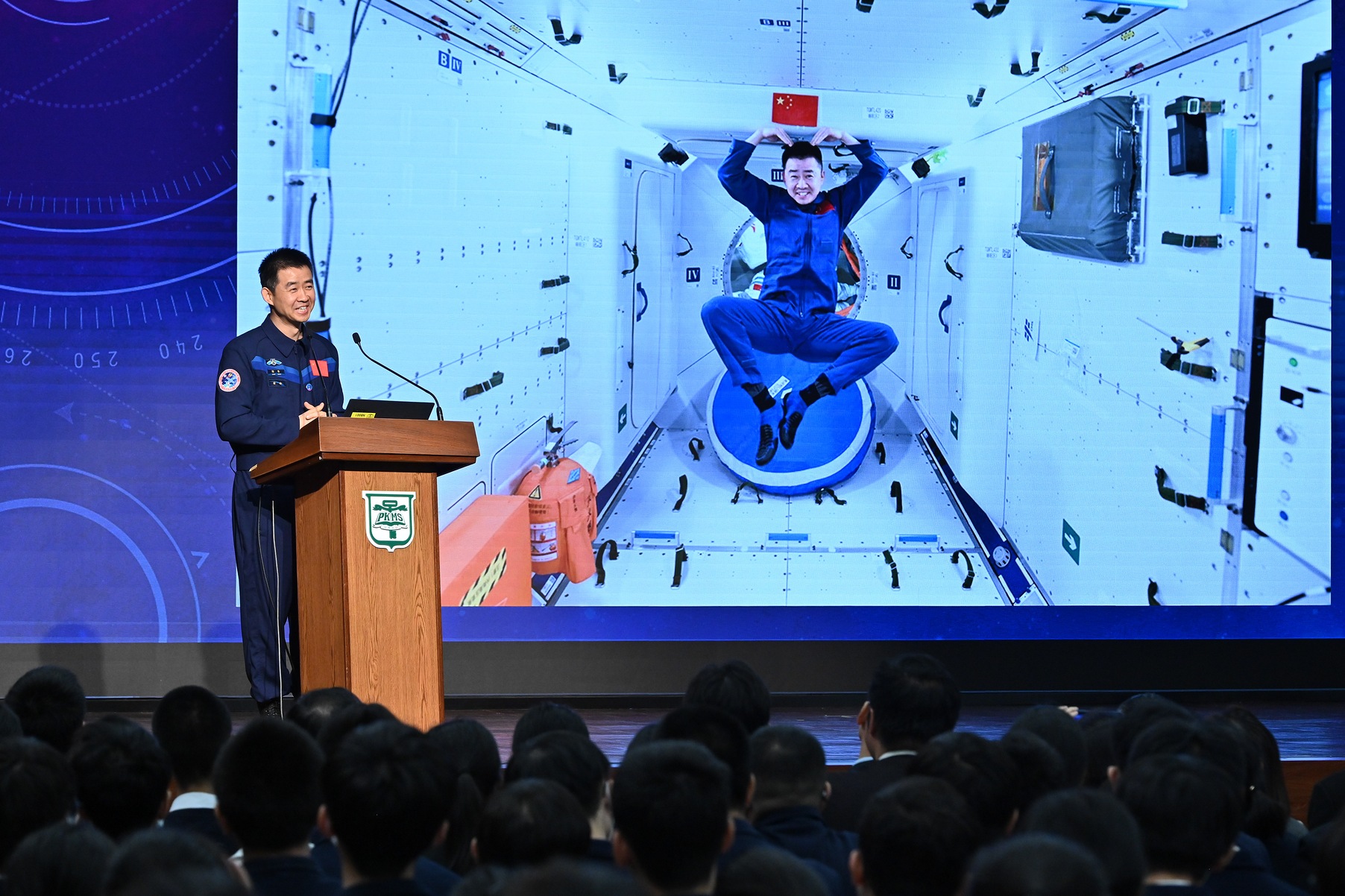 中國載人航天工程代表團11月29日繼續在港訪問,圖示神舟十四號乘組指令長陳冬出席在培僑中學舉行的“中國載人航天工程代表團與中、小學生真情對話”活動。