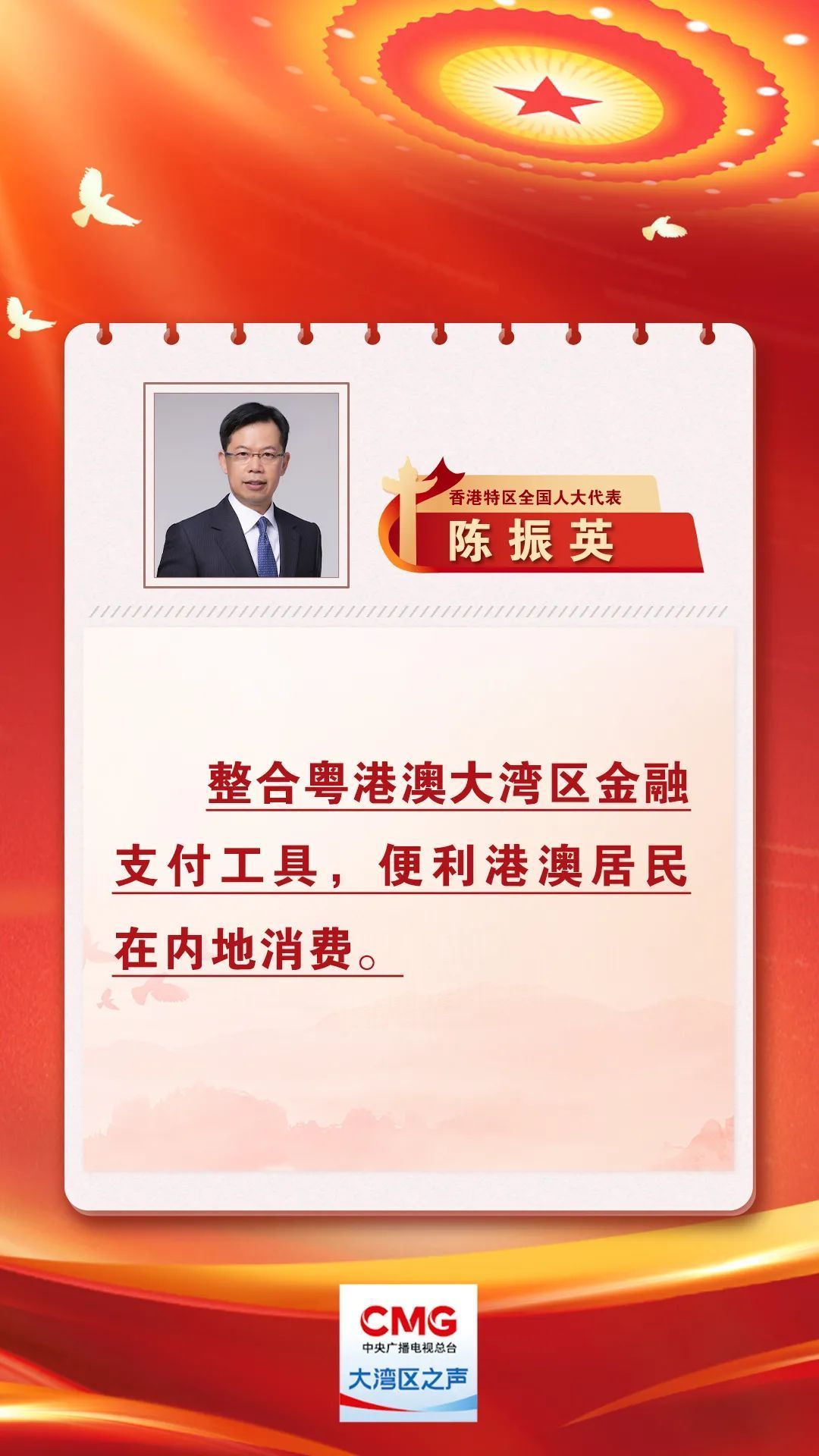 香港特區全國人大代表陳振英帶來多項有關便利港澳居民在內地出行與消費的相關建議。他建議整合粵港澳大灣區金融支付工具,推出官方支付平臺,實現大灣區內任何錢包自動兌換貨幣支付功能,從而進一步便利港澳居民在內地的出行和消費。
