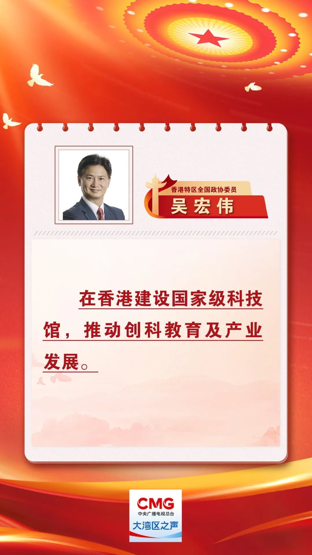 香港特區全國政協委員吳宏偉將在今年兩會提交有關在香港建設國家級科技館的提案。他建議香港與北京的中國科技館合作,整合粵港澳大灣區科學館資源優勢,依托香港、輻射灣區,在香港建設一所綜合性、國家級、乃至世界級的科技館,講好中國科技故事,建設新時代的愛國教育基地。