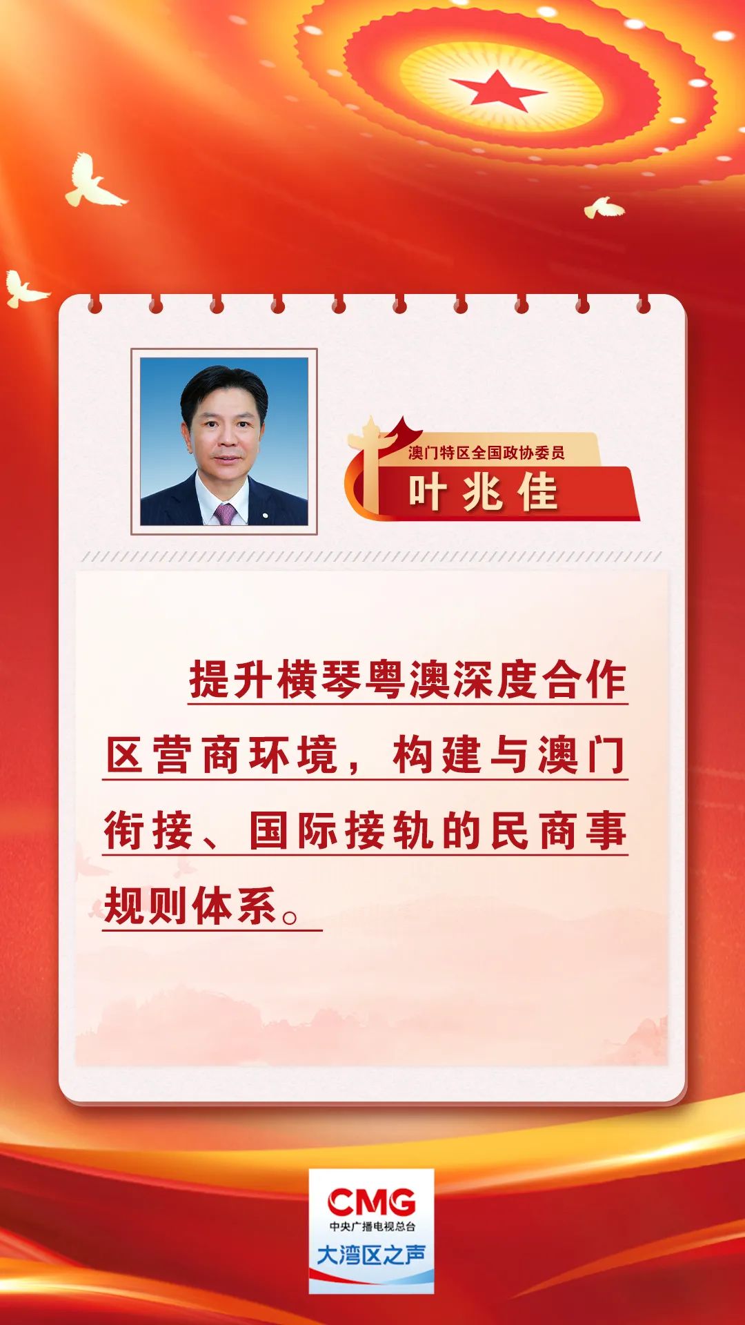 澳門特區全國政協委員葉兆佳在今年兩會提交了《提升橫琴粵澳深度合作區營商環境,構建民商事規則銜接澳門、接軌國際的制度體系》的提案。他建議參考國際經驗或參照內地海南的做法,從全國人大層面制定合作區涵蓋經濟金融等領域的民商事法律制度;或參考上海自貿試驗區的經驗,通過全國人大授權廣東省或者橫琴,提升地方的立法權限,給予廣東省或合作區在民商事法律法規上更大力度的立法支持,推動構建與澳門銜接、國際接軌的民商事規則體系。