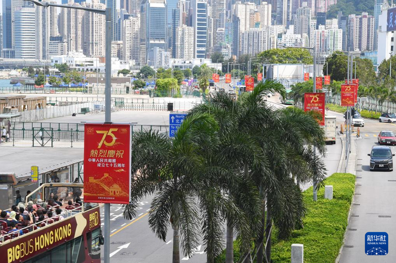 這是10月3日在香港街頭拍攝的國慶75周年海報。新華社記者 陳鐸 攝