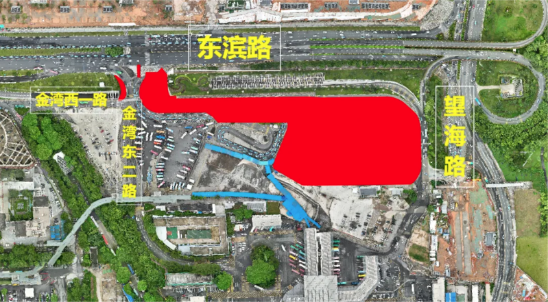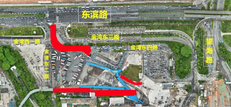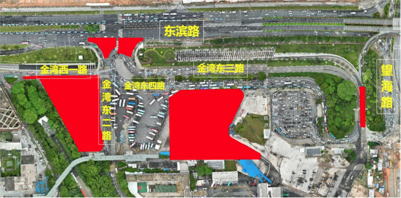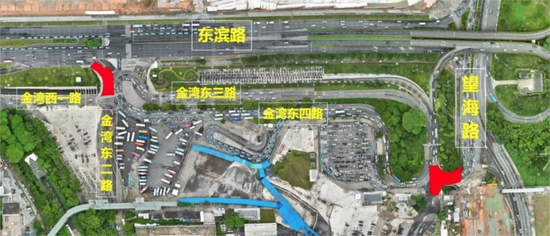 ?、?strong>開放旅巴接駁區和網約車落客區,封閉金灣東三路、現社會車停車區、現公交車接駁區等區域施工。