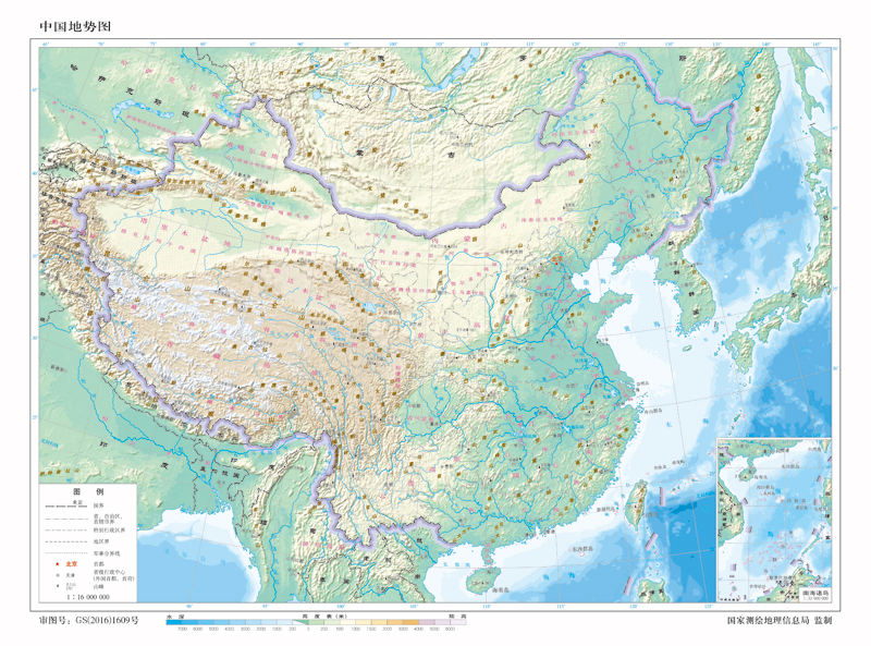 中國地勢西高東低,山地、高原和丘陵約占陸地面積的67%,盆地和平原約占陸地面積的33%。山脈多呈東西和東北一西南走向,主要有阿爾泰山、天山、昆侖山、喀喇昆侖山、喜馬拉雅山、陰山、秦嶺、南嶺、大興安嶺、長白山、太行山、武夷山、臺灣山脈和橫斷山等山脈。西部有世界上最高大的青藏高原,平均海拔4000米以上,素有“世界屋脊”之稱,珠穆朗瑪峰海拔8844.43米,為世界第一高峰。在此以北以東的內蒙古、新疆地區、黃土高原、四川盆地和云貴高原,是中國地勢的第二級階梯。大興安嶺一太行山一巫山一武陵山一雪峰山一線以東至海岸線多為平原和丘陵,是第三級階梯。海岸線以東以南的大陸架,蘊藏著豐富的海底資源。
